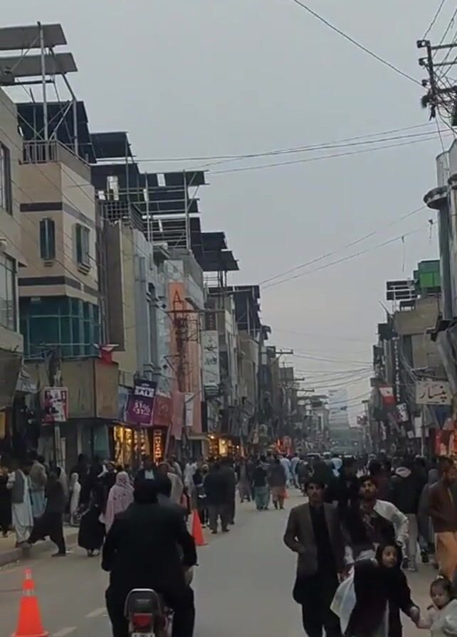 busy street scene in what appears to be a city. The street is filled with pedestrians walking in both directions, and motorcycles are driving through the crowd. Buildings line both sides of the street, with shops and signs visible. Some buildings have solar panels on their roofs. Several "Winter Sale" signs are visible on storefronts. The sky is overcast.