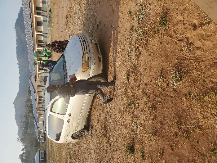 The scene depicts an open, dry, reddish-brown earth expanse in Lokoja, Nigeria, characterized by sparse, dried vegetation. In the background, under a clear, bright sky, multiple single-story buildings with light-colored walls and dark roofs are visible, some equipped with solar panels. Distant hills with vegetation rise on the horizon. A light-colored, first-generation Toyota Sienna minivan (license plate FKJ-79XA partially visible) is stationary in the mid-ground, oriented towards the right. A male individual, wearing a dark suit, yellow tie, and glasses, is captured in motion, walking leftward past the front of the minivan while holding a small, reddish-orange rectangular object in his left hand. Two other individuals stand behind the minivan's front passenger side: a male wearing a dark patterned shirt and a light-colored cap, and a female dressed in a red, black, and white patterned garment with a matching headwrap. Both are observing the foreground. A green and yellow playground structure is partially visible behind the minivan, adjacent to the buildings.