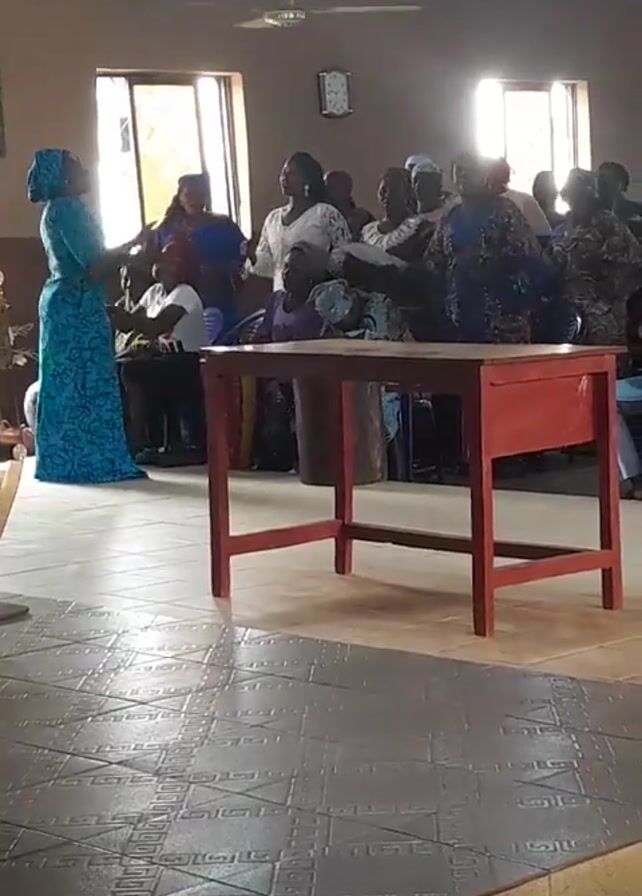 group of women in a room that appears to be a church or community hall. The women are standing together and appear to be singing or chanting. One woman, dressed in a long blue patterned dress and headwrap, stands to the left and leads the singing. The other women are dressed in a variety of colorful traditional clothing. A red wooden table is in the foreground, slightly off-center. The room has several windows, and a ceiling fan is visible. The floor is tiled with a textured pattern. The lighting is a bit dim but seems to come from both the windows and overhead lights.