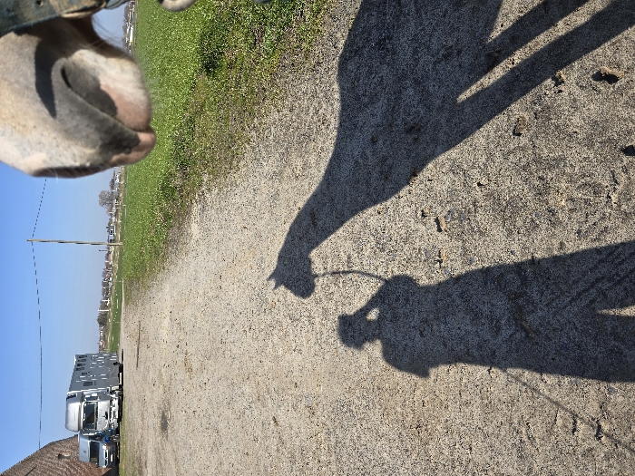 The image displays an outdoor scene in Estaimpuis, Belgium, under a clear blue sky with strong overhead sunlight. In the immediate foreground, the partial muzzle of a light-colored horse, fitted with a dark halter or bridle, is visible in the upper right quadrant. On the light-colored, granular ground surface, two distinct elongated shadows are cast: a human figure holding an object consistent with a camera on the left, and a full horse silhouette on the right. A thin line, consistent with a lead rope, is discernible connecting the human shadow to the horse's. The central feature is a light-colored gravel path extending into the background, curving gently to the right. To the left of this path, a section of a reddish-brown brick building is visible. Adjacent to the building, two vehicles are parked: a large silver truck fitted with a multi-compartment horse trailer, and a smaller, light-colored van positioned behind the truck. To the right of the path, a field of vibrant green vegetation stretches into the distance. A single utility pole with overhead power lines stands in the mid-ground. The distant horizon reveals structures and trees under the clear sky.