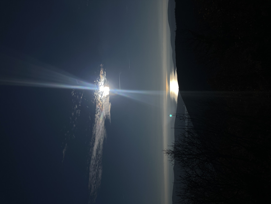This image depicts a wide-angle landscape view captured from a high vantage point in Mrčevac, Montenegro, likely during sunrise or sunset. The scene is dominated by a dark blue sky, where a bright sun, partially obscured by a horizontal bank of iridescent clouds, is positioned in the upper-right quadrant. Strong, vertical lens flares emanate from the sun, extending upwards and downwards across the frame. In the mid-ground, a large body of water, presumably a bay or the Adriatic Sea, stretches horizontally. The sun's intense light creates a prominent, shimmering golden-orange reflection across the water's surface, forming a bright streak that extends towards the viewer. A distinct green circular lens flare is visible over the water, slightly left of center. The distant horizon across the water shows a hazy outline of land or a distant shore. The foreground and mid-ground consist of multiple layers of dark, silhouetted mountains or hills, characterized by their undulating ridges and absence of detailed features due to being heavily shadowed. In the lower-left corner, bare, leafless tree branches or dense shrubbery are visible as dark silhouettes, partially framing the panoramic view. No people, human actions, or distinct man-made structures are discernible within the visible landscape.