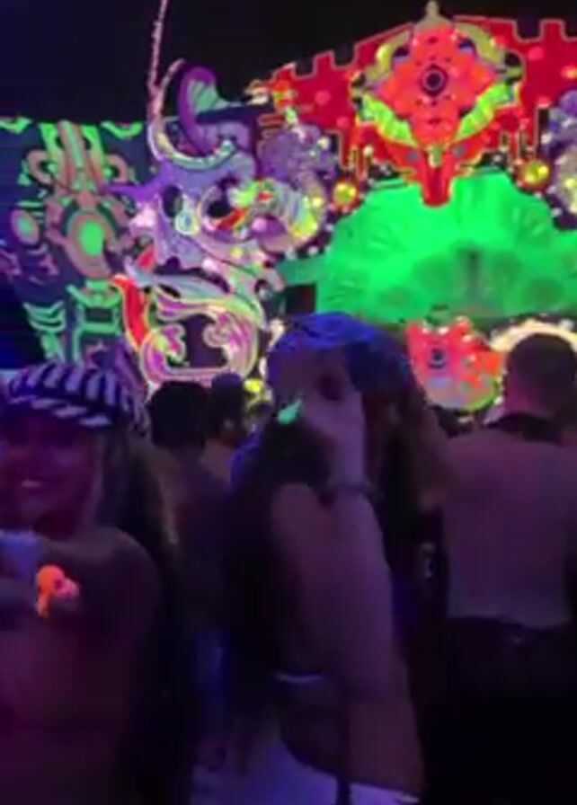 The video captures a vibrant rave scene at night