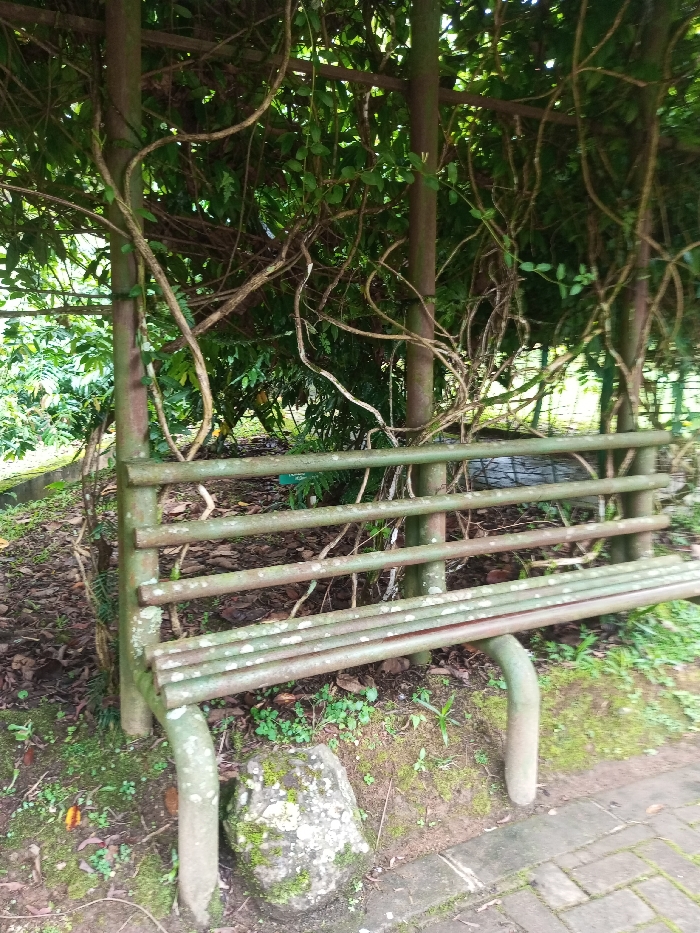 - "An outdoor scene in the city of Kanand, India, features a weathered, green-painted metal bench positioned beneath a heavily overgrown metal pergola" by FM-cpNIc2, licensed under CC BY 4.0
