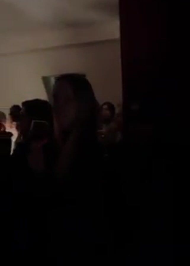 A group of people stand in a dimly lit room, facing away from the camera. A window with curtains is visible in the background. The room has a white ceiling and the walls are painted in different colors. It is difficult to discern details due to the low light conditions.