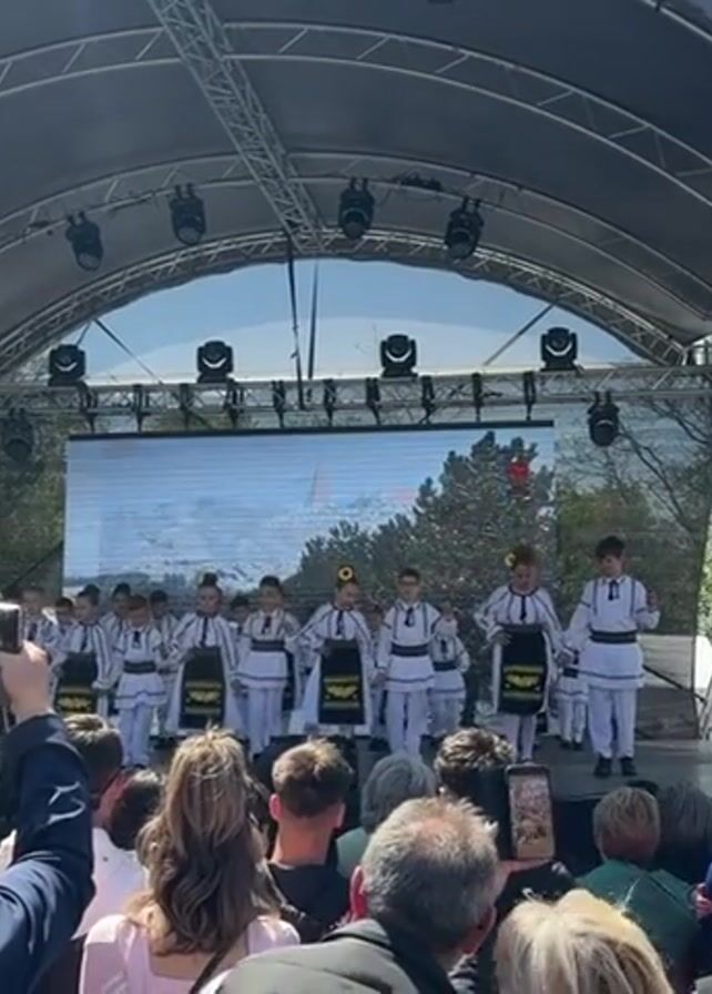 A group of children dressed in white folk costumes with black and gold embroidery perform on a stage. They are playing drums. The stage has a large screen behind them showing a landscape with a building. An audience stands in front of the stage, many holding up their phones to record the performance. The stage is covered with a gray canopy supported by metal scaffolding. Speakers hang from the scaffolding. Trees are visible in the background under a clear blue sky. The scene appears to be an outdoor festival or performance.