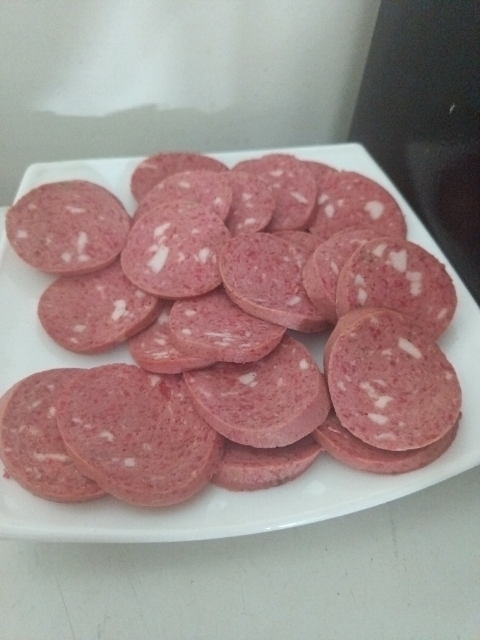A white square plate is piled with slices of sausage. The sausage is pinkish-red with white specks throughout. The slices are circular and overlapping, creating a dense arrangement. A corner of what appears to be a dark-colored appliance is visible in the background. The background wall is partially visible as well.