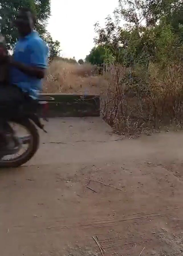 flat, dusty dirt road with a concrete block spanning a section of it. The surrounding area features dry grass and various trees. A person rides a motorbike from left to right, moving away from the camera into the distance, along the road. A tall cell tower is visible in the background.