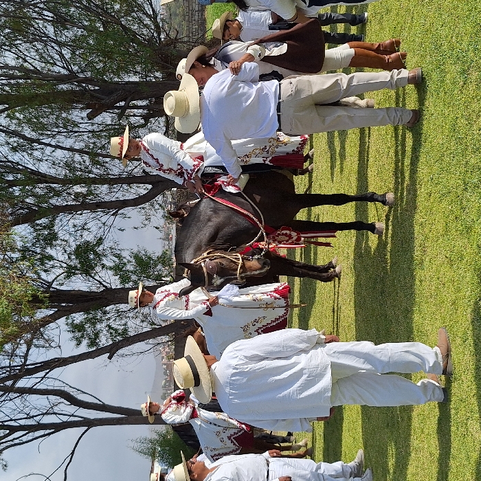 A group of people, mostly wearing white traditional clothing and straw hats, are gathered on a grassy field. One person is on horseback, adorned with a red and white decorative saddle. Some people are standing, while others are in line. Trees frame the left side of the image. The scene appears to be part of a cultural event or parade, possibly in a rural setting.