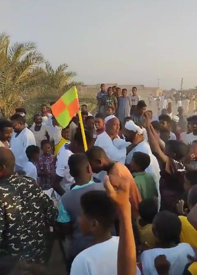 Here is a description of the scene in the video: The video shows a large group of people gathered in what appears to be an open area with palm trees. The crowd is mostly composed of men and children, and many are wearing white or light-colored clothing. Some individuals are raising their fists in the air, while others are clapping. At the center of the crowd, a man in a white shirt is being carried on someone's shoulders. He is smiling and waving, and he is holding a flag with red, orange, and green colors. The overall atmosphere seems festive and celebratory. The background includes buildings and what looks like a desert landscape under a clear sky.