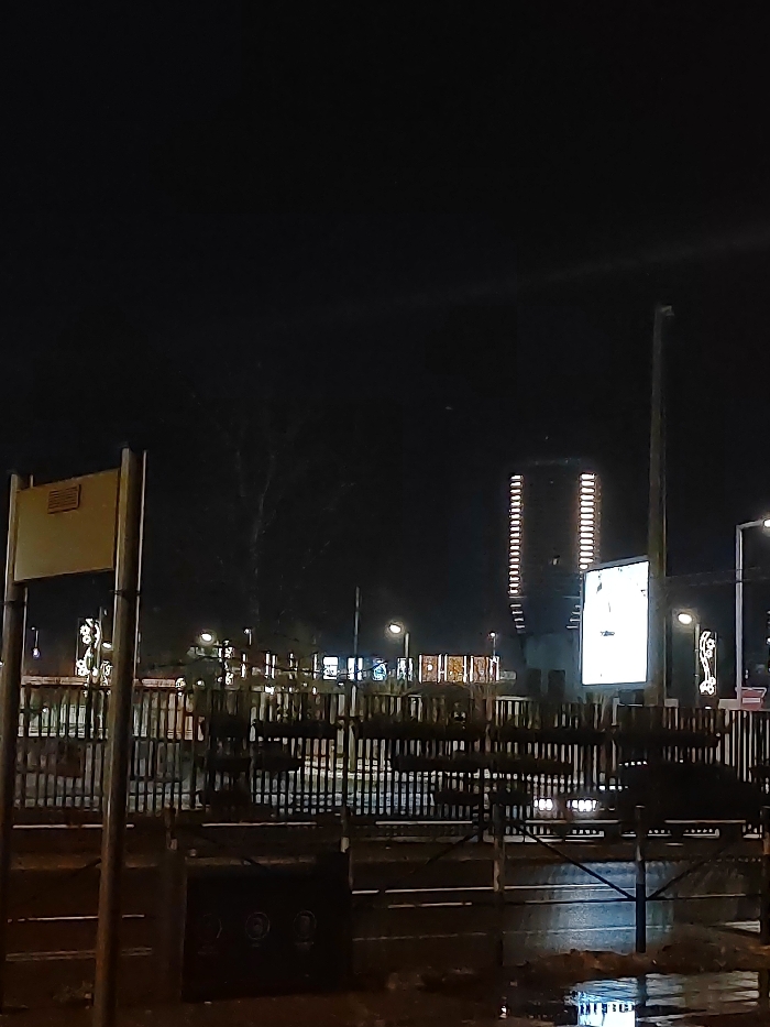 - "A nighttime scene features a dark sky and a distant building illuminated with vertical lines of light" by FM-v6UTs2, licensed under CC BY 4.0