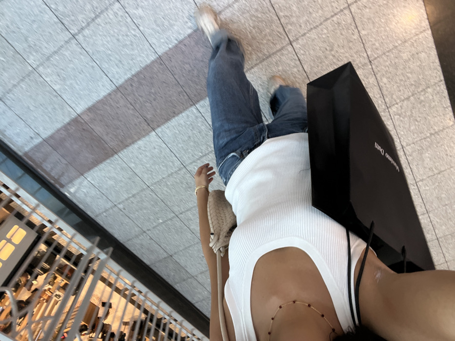 The image presents an overhead view of a single individual walking through NorteShopping mall in Senhora da Hora, Portugal. The subject, observed from the chest downwards, is attired in a white ribbed tank top, blue denim jeans, and light-colored athletic footwear, with a slight blur indicating motion. A thin gold-toned necklace with small red beads adorns the neck, and a gold-toned bracelet is visible on the right wrist. A beige, woven-texture shoulder bag is slung over the right side of the body. The individual's left hand holds a black shopping bag displaying the "Massimo Dutti" logo in white text. The flooring consists of light grey square tiles, bisected by a prominent, darker grey or reddish-brown diagonal stripe. In the upper background, a white metal railing with horizontal bars separates the current level from a lower or adjacent retail area, characterized by blurred artificial lighting and indistinct commercial displays.