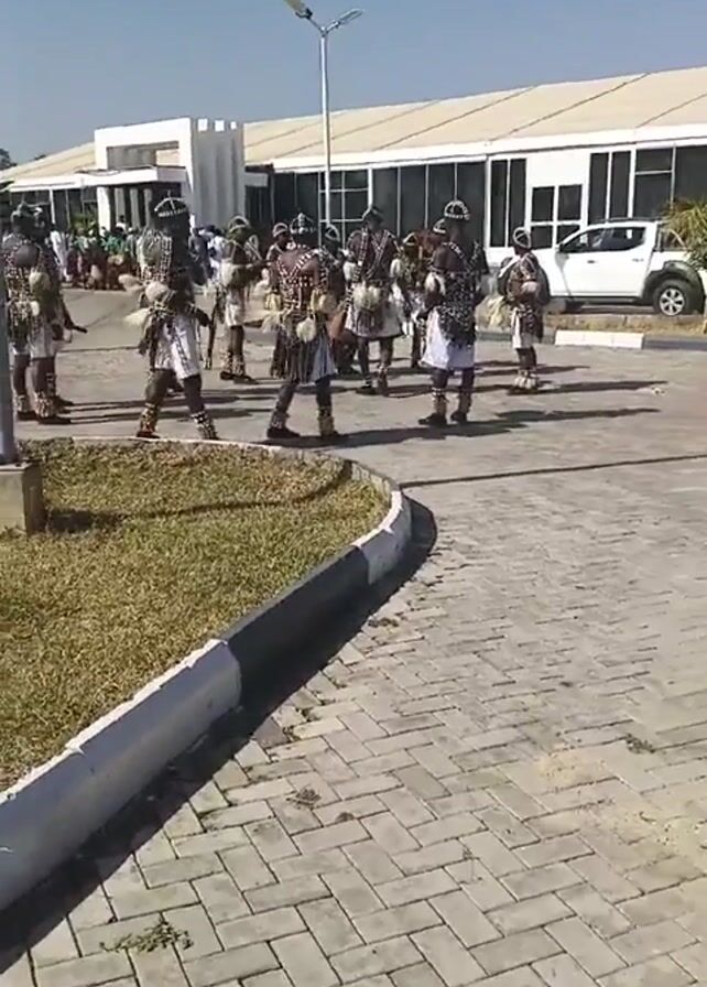 A group of drummers in traditional dress are performing outside a white building on a sunny day. They are wearing elaborate headdresses and patterned clothing, and they each carry a drum. A man in a suit walks behind them. There is a crowd of people in the background, and a white pickup truck is parked nearby. The ground is paved with bricks, and there is a patch of grass near the camera.