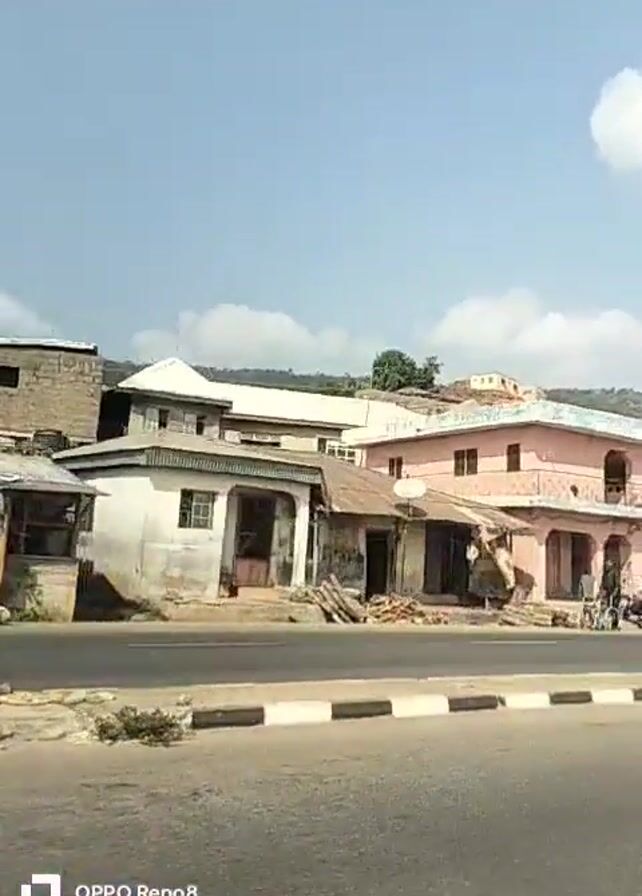 view of a road in what appears to be a town or village. In the initial shot, two men are on a motorcycle moving along the road. Buildings of varying sizes and conditions line the roadside, some with corrugated iron roofs. A three-wheeled vehicle, possibly a taxi or tricycle, is visible as well. Later, the video follows a black pickup truck with people in the back moving in the same direction. People can be seen walking along the road and riding motorcycles. The background features a hill with houses built up the slope. The sky is blue with scattered clouds. A tall, thin solar-powered street light stands along the roadside. The video is taken from a moving vehicle. The lower left corner of the screen shows the text "OPPO Reno 8".