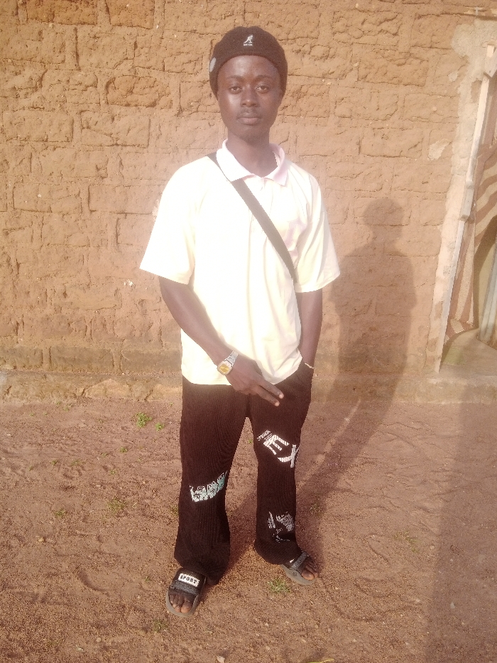 A young man in a black Kangol-style hat stands outdoors. He wears a pale yellow short-sleeved polo shirt with a black strap across his chest, dark pants with white graphics, and sandals. He holds up two fingers in a peace sign with his left hand. The background features a weathered mud-brick wall and an out-of-focus structure to the right. The ground is dirt with sparse patches of green.