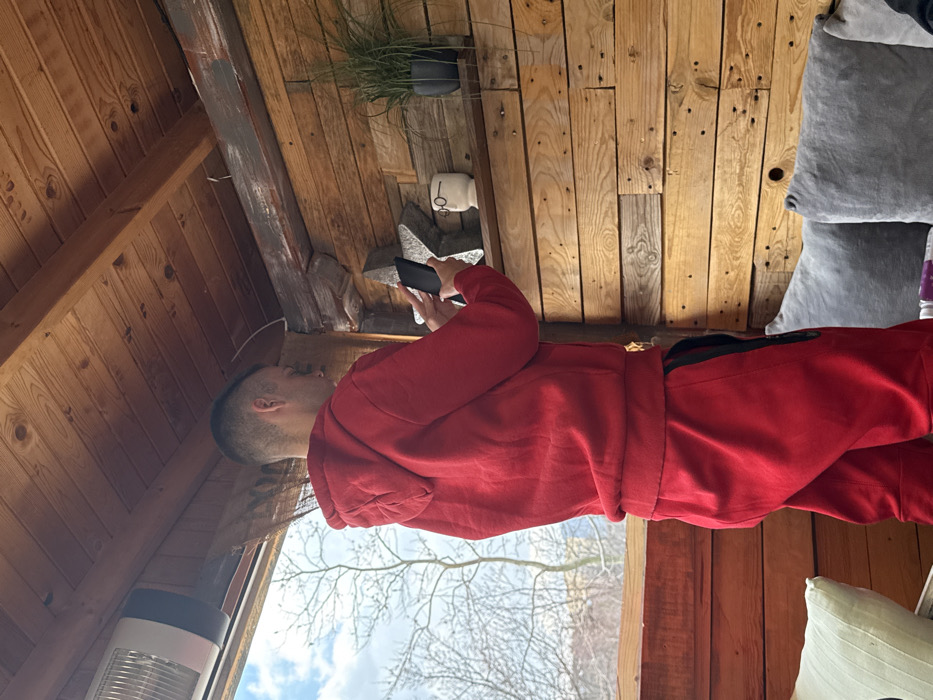 An interior scene in Sliven, Bulgaria, depicts a male subject positioned with his left side and back to the viewer. He wears a red hooded sweatshirt and red sweatpants with a black vertical stripe on the outer leg. The subject is holding a black smartphone horizontally with both hands, directing it towards a narrow wooden shelf mounted on a textured wooden plank wall to his right. The shelf holds a silver star-shaped ornament, a white mug with painted black glasses, and a dark grey pot containing a green artificial grass-like plant. The interior features light brown wooden paneling on walls and ceiling, with visible beams, one partially painted grey. An elongated white and grey electric heater is mounted on the ceiling in the upper left. Partial views of grey cushions are visible in the lower right, suggesting a seating area. Through a window or opening to the left, a partially cloudy blue sky and bare deciduous trees are visible against a distant, undulating landscape, indicating an outdoor setting during a cold season.