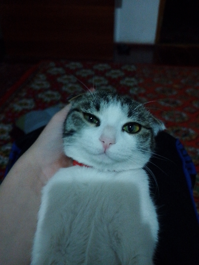 A white and grey tabby cat with green eyes is held in a person's arm. The cat has a red collar. The background features a dark brown wooden dresser or cabinet and a red patterned rug. The cat's face is the focal point, with the rest of its body blurry. The setting appears to be indoors.