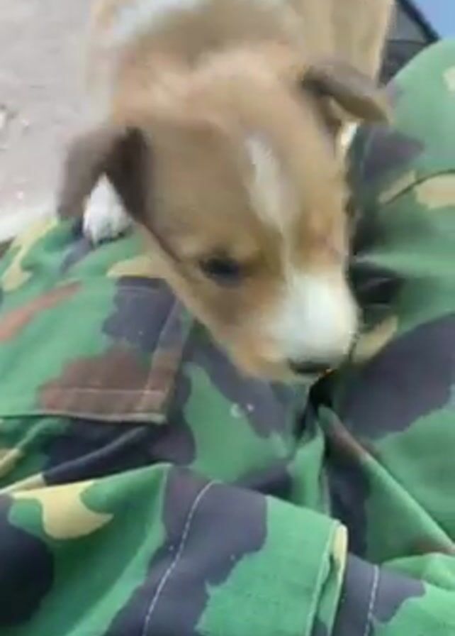 A brown and white puppy stands on the lap of someone wearing camouflage pants
