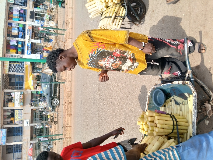 This image depicts an outdoor urban scene in Heany, Zimbabwe, featuring three males interacting near a sugarcane cart under bright daylight