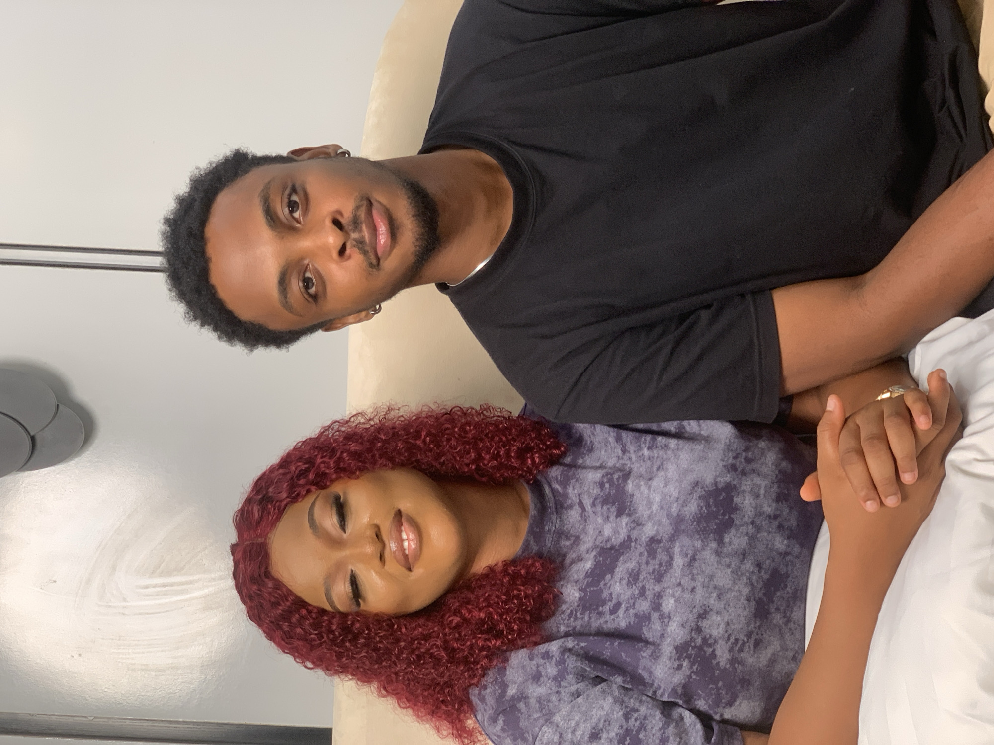 The image displays two individuals, one female and one male, seated indoors against a light-grey wall, in what is understood to be Moba, Nigeria. The female, positioned on the left, presents with dark skin, red curly shoulder-length hair, and wears a purple short-sleeved t-shirt with a mottled or tie-dye pattern. Her eyes are partially closed, and her lips are slightly parted in a faint smile. Her hands are clasped in front of her, resting on a white surface, with a metallic ring visible on her right ring finger. The male, positioned on the right, exhibits dark skin, short dark curly hair, a beard, and a mustache. He wears a black short-sleeved t-shirt and small silver hoop earrings in both ears. His eyes are open and directed forward. Both individuals are seated on a light-colored, upholstered surface, possibly a sofa or bed. A grey, layered circular wall decoration is partially visible in the upper right quadrant of the background.