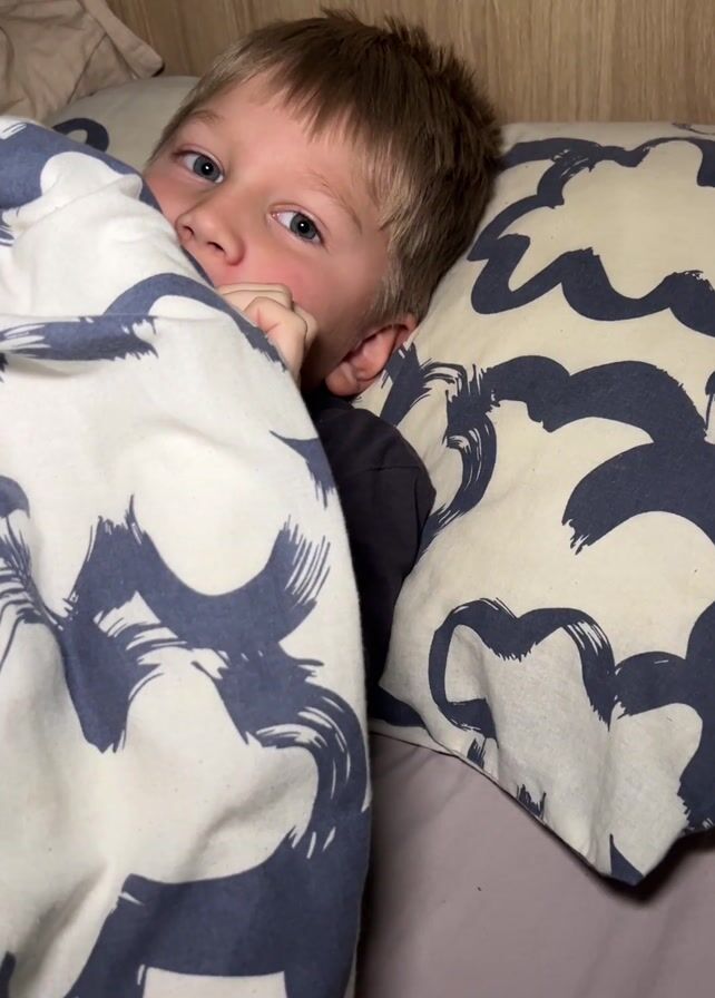A young boy is lying in bed under a patterned blanket and pillow