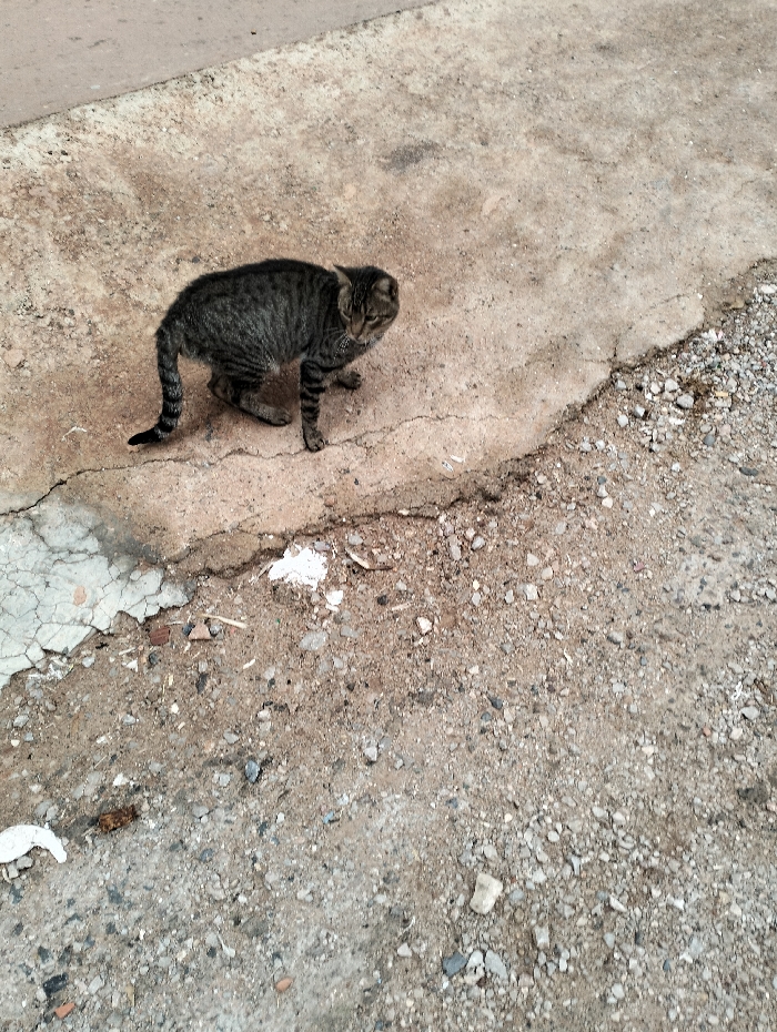 - "A dark gray and black striped tabby cat stands on a cracked, light brown concrete surface, adjacent to a dirt and gravel area" by FM-PJNzU2, licensed under CC BY 4.0