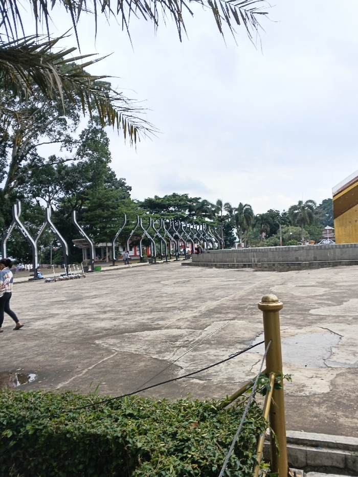 The image depicts an outdoor public plaza at Tao Dan Park in Ho Chi Minh City, Vietnam, under an overcast sky. In the foreground, a golden bollard with a black cable forms a barrier above a low green hedge. The plaza surface is predominantly cracked and worn grey concrete, with a small puddle visible on the far left. In the midground, a person, appearing female, dressed in dark pants and a light patterned top, walks from left to right across the plaza. Further left, a row of approximately five white electric scooters is parked. A linear series of about ten uniformly spaced, stylized metal arch structures, featuring black and white elements and faint text such as "Culture" and "Nature," extends from the left-center to the right-center of the image. Beyond these structures, a building with a white facade and red trim is partially visible amidst dense green trees. To the right of the plaza, a multi-tiered concrete structure, possibly a fountain or planter, serves as a boundary; one individual is seated on its edge. On the far right, a portion of a large, yellow-brown building with horizontal banding is visible. The background consists of abundant green trees, including palm trees, and obscured distant buildings, all under a pale, cloudy sky.