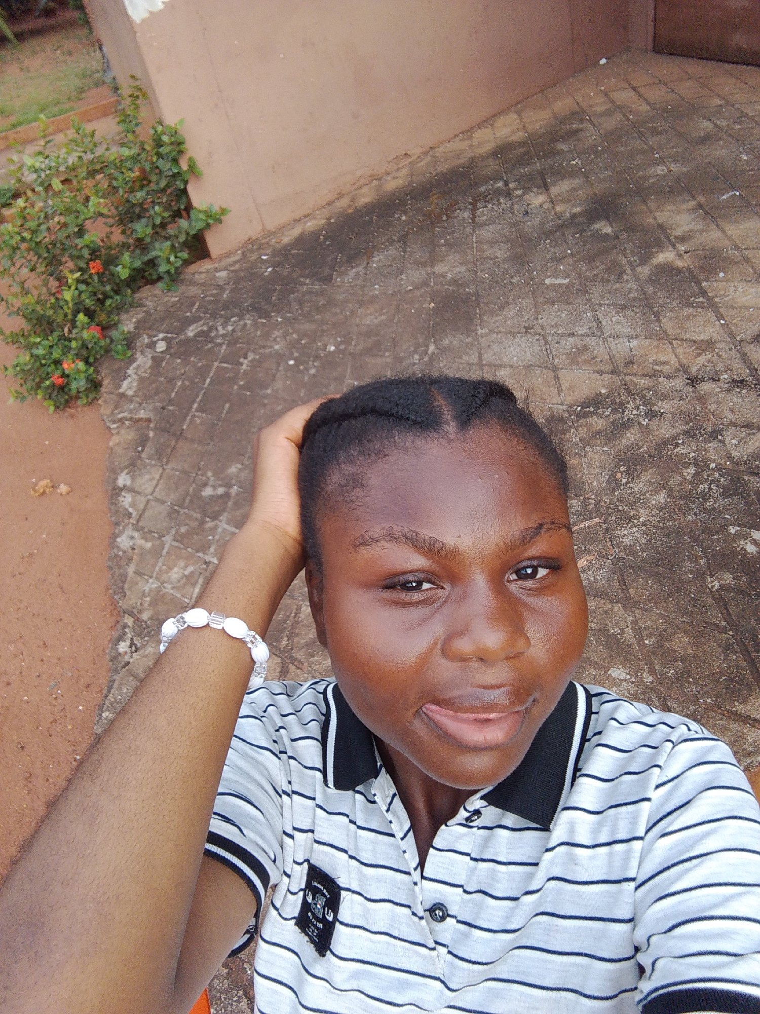 A young, dark-skinned woman is standing outside. She is wearing a striped short-sleeved polo shirt and a beaded bracelet on her left wrist. She is touching her braided hair with her left hand and sticking out her tongue slightly. The background includes a building with a reddish-brown wall and a concrete patio area. A small green bush with red flowers is visible next to the wall. The location may be Nsukka, Nigeria.