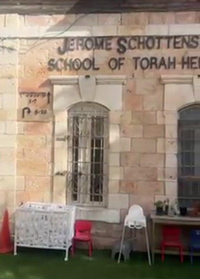 exterior of the Jerome Schottenstein School of Torah Heritage building. The building is made of light-colored stone blocks and has a brown wooden roof. There are several windows with metal bars and an arched doorway. Outside, there is a small area of artificial grass with several children's items, including a crib, chairs, a high chair, and a small wooden table with a dog statue and several plants. There is also a trash can and two chairs. The sky is blue and sunny.