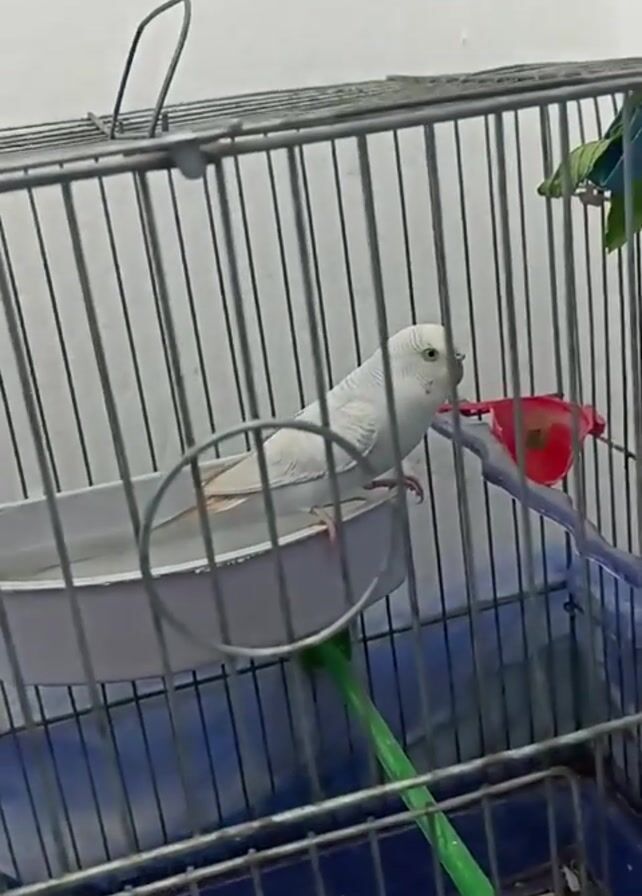 - "A parakeet stands in a small tub of water inside of a birdcage" by FM-gHPc12, licensed under CC BY 4.0