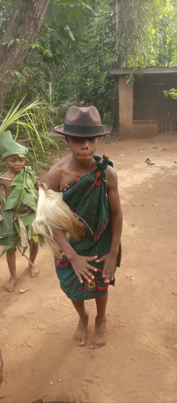The scene is an outdoor setting in Amokwue-Affa, Nigeria, featuring two individuals on reddish-brown compacted earth. In the foreground, a young person, appearing to be a pre-teen, stands wearing a brown fedora hat with a dark band and a dark green patterned cloth wrapped around their lower body, leaving their upper torso bare. They hold a pale, whisk-like fibrous object in front of their waist with both hands. Their feet are bare. To their left and slightly behind, a younger child, also barefoot, is partially visible, dressed in a green leaf hat and a body covering made of green leaves. The background is dominated by dense green foliage and tree trunks. On the right, a light brown single-story building with a corrugated metal roof and a dark-barred window is visible. Two pairs of light-colored footwear are present on the ground near the building.