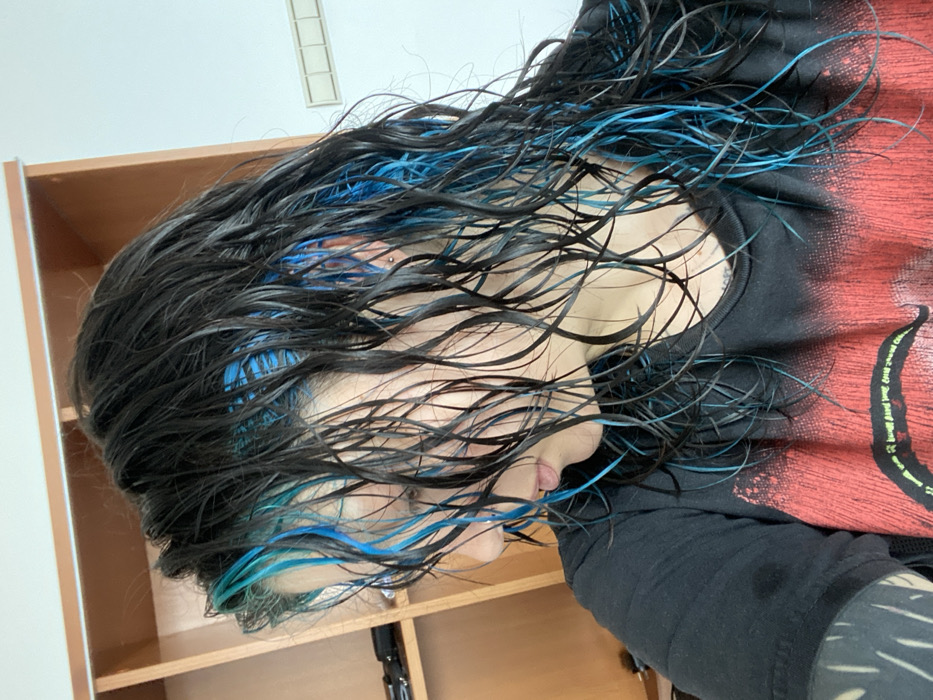 The image presents a close-up, side profile view of an individual within an indoor setting. The subject's dark, medium-length hair is heavily wet, exhibiting distinct, dripping strands, with prominent sections dyed a bright blue. The individual is looking downwards and slightly to their left, partially obscuring the face. A silver stud piercing is visible on the right earlobe. The person is wearing a dark, likely black, short-sleeved t-shirt with a large red graphic design on the chest. A wet patch is noticeable on the left shoulder of the t-shirt. The left forearm displays a black sleeve with white, abstract patterns. The background to the left features a light brown wooden open shelving unit. To the right, a plain light-colored wall displays a white rectangular electrical fixture containing multiple square segments. The specific location within the city of Gijón, Spain, is not ascertainable from the visual evidence.