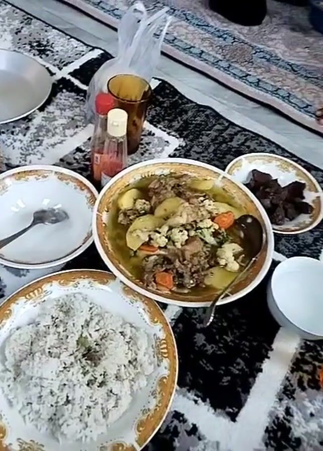 meal spread out on a patterned carpet. There are several plates, two filled with rice, one with a stew containing meat and vegetables, and another with what appears to be cooked meat. There's also an empty plate with a spoon, a glass, two bottles (likely condiments), and a small white bowl. A plastic bag sits near the bottles. A hand is briefly visible at the top right of the frame.