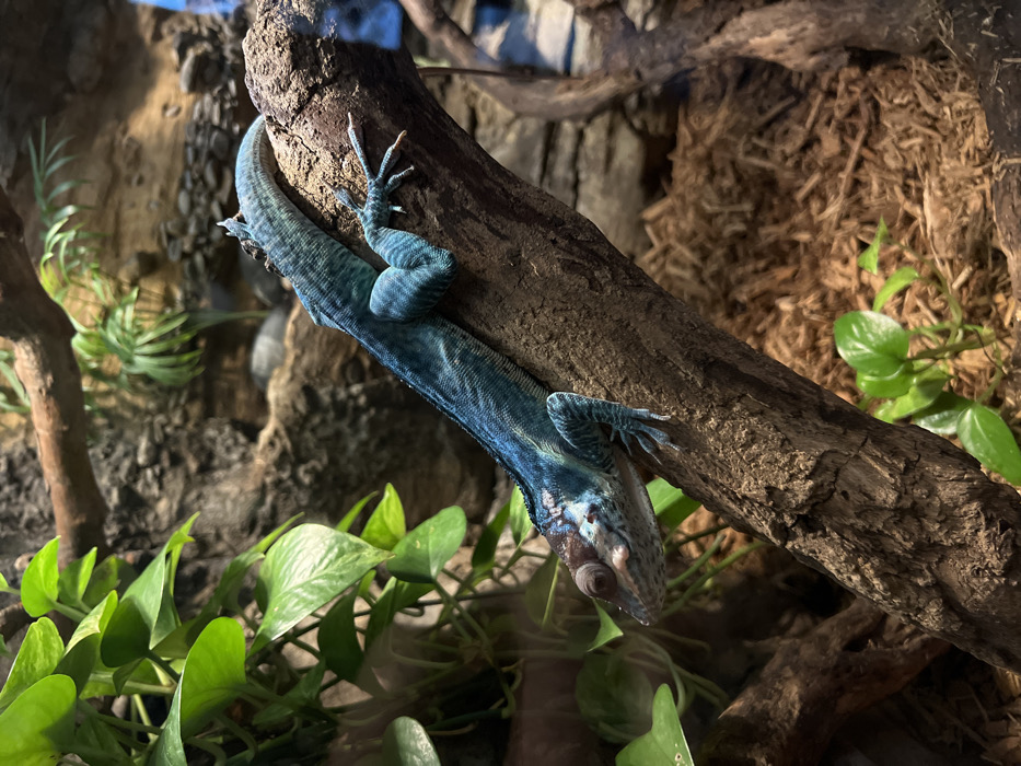 A blue lizard clings to a thick, brown branch. Its patterned blue scales cover its entire body. The lizard's head points downward, and its legs grip the branch tightly. Green plants surround the branch and the lizard, creating a natural habitat. The background features wood chips, rocks, and faint artificial lighting.