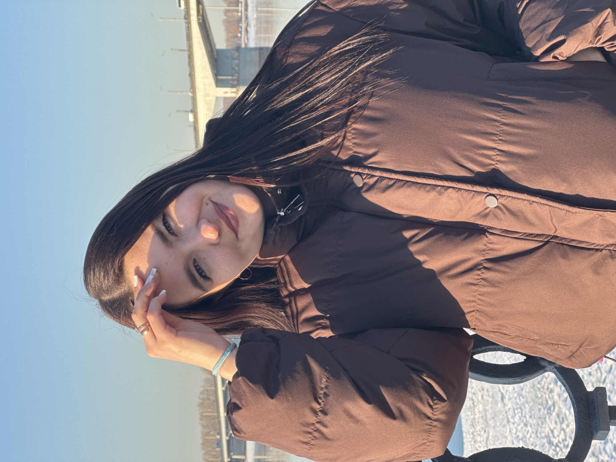 The image depicts a young female standing outdoors on what appears to be an embankment or promenade in Perm, Russia. The subject, with long, dark brown hair, is positioned slightly off-center to the left, looking directly at the camera with a slight smile. She wears a brown, quilted puffer jacket. Her right hand is raised, with fingers near her temple. A gold-toned ring is visible on her right ring finger, and a light blue beaded bracelet is on her right wrist. Her fingernails have white tips. In the background, the Kama River is visible, partially covered by ice or snow, indicating cold weather conditions. Spanning the river is the Kommunalny Bridge (also known as Perm Bridge), a prominent multi-lane concrete and steel structure with visible traffic. The far bank of the river shows sparse, bare trees. The sky is clear and light blue. Strong sunlight originates from the right side of the frame, illuminating the subject's face and jacket, and casting distinct shadows. A black, ornate metal railing is partially visible in the lower-left foreground.