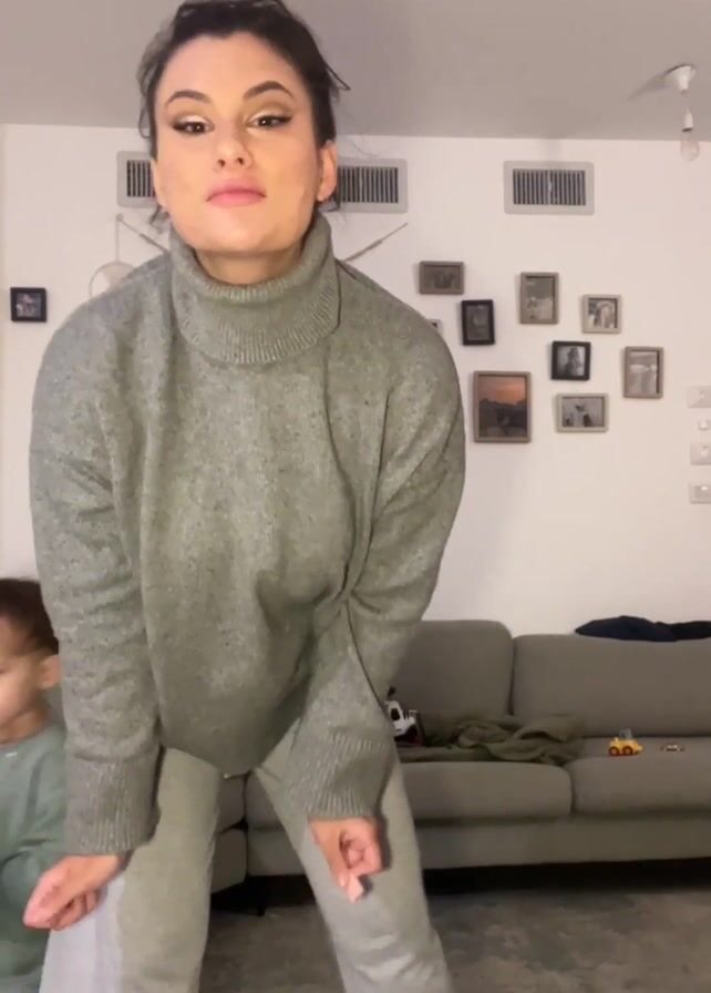 A woman with dark hair in a bun, wearing a grey turtleneck sweater and light grey wide-legged pants, dances in a living room. A toddler, also wearing a grey top, watches her from behind a grey couch. The room has white walls decorated with a grid of small framed pictures. A white fan hangs on the wall. The couch has a blanket and toys on it. The music is upbeat electronic dance music. The woman makes exaggerated dance moves, including bouncing, hip movements, and pouting her lips. The toddler occasionally wanders in front of her and waves his arms, mirroring her.