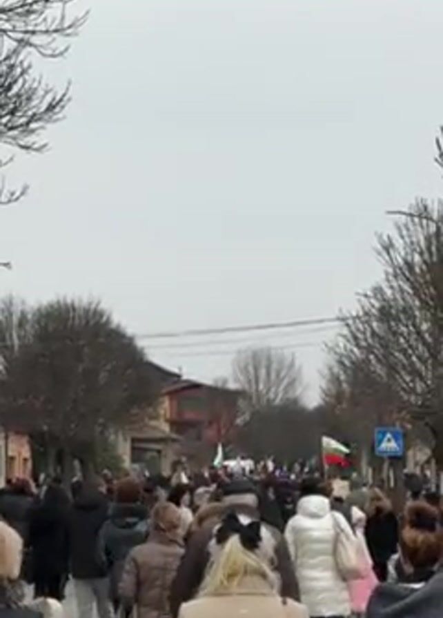 large crowd of people walking down a street in what appears to be a village or small town. Most people are wearing winter clothing, such as coats and hats. The camera is positioned from within the crowd, looking forward, slightly upward. Several Bulgarian flags are visible throughout the procession, held by participants. Trees with bare branches line the sides of the street. Buildings, including houses, are visible on both sides of the street. The sky is overcast and grey. The general impression is that of a patriotic march or parade.