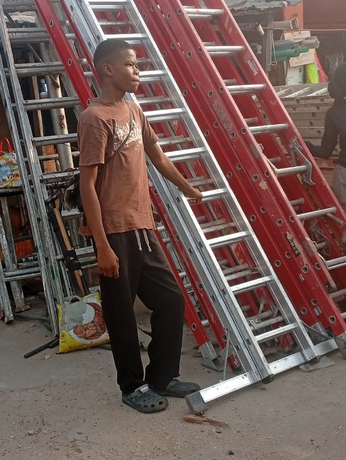 The image captures an outdoor commercial scene in Lokoja, Nigeria, featuring a prominent display of ladders