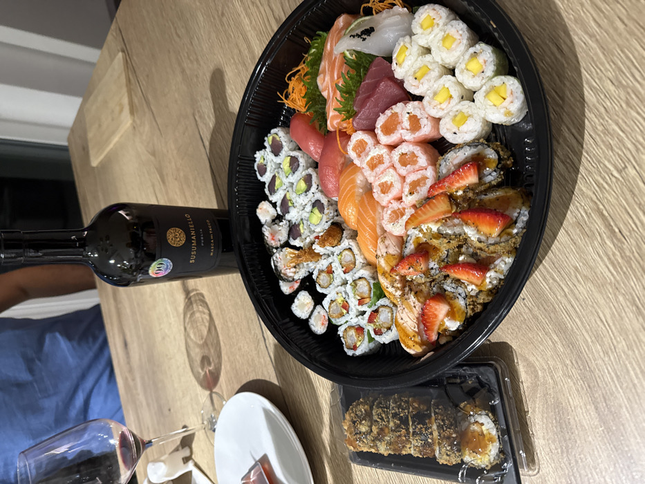 The image depicts an indoor dining setting on a light brown wooden table in Pétange, Luxembourg. A large, circular black platter, approximately 40-50 cm in diameter, occupies the foreground and center-right, filled with a diverse assortment of sushi. This assortment includes multiple types of maki rolls (featuring ingredients like tuna, avocado, shrimp tempura, cream cheese, and mango), nigiri (salmon, tuna), and sashimi (salmon, tuna, white fish). Several maki rolls are topped with thinly sliced strawberries and a glaze, while others appear deep-fried and drizzled with sauce. To the immediate left of the large platter, a smaller, clear plastic rectangular container holds eight pieces of deep-fried sushi rolls, also drizzled with a dark sauce. Behind the main sushi platter, a dark-colored glass bottle of "SUSUMANIELLO" red wine from Puglia, Italy (Masca del Tacco brand), stands upright, featuring a "99" sticker on its label. To the left of the wine bottle, a clear stemmed wine glass, partially filled with red wine, rests on the table, casting a shadow. Further to the left, a white circular plate holds a small, dark, rectangular food item. In the blurry background, the upper torso and left arm of an individual wearing a blue short-sleeved shirt are partially visible.