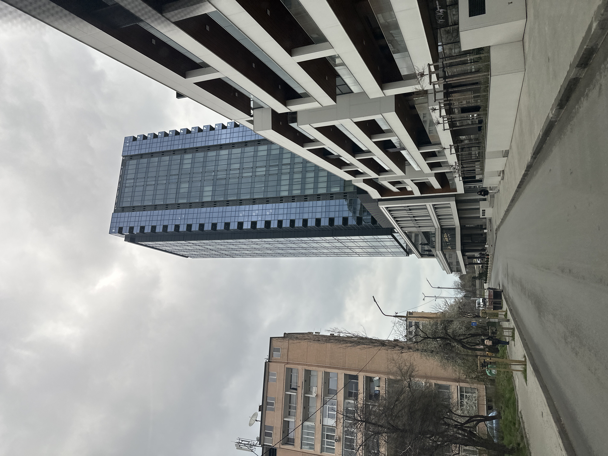 The image depicts an urban street scene in Sofia, Bulgaria, specifically showcasing the area around Tsarigradsko shose Blvd. 90. The scene is dominated by a clear architectural contrast under an overcast, grey sky. To the right and centrally, the modern Capital Fort skyscraper rises, characterized by its tall, slender form, reflective blue glass facade, and a pattern of recessed sections suggesting balconies. Adjacent to it on the right is a lower, multi-story modern building with clean white facades, distinct horizontal brown accents, and numerous balconies featuring clear glass railings. On the left, an older, light brown/pinkish multi-story residential building stands, exhibiting exposed concrete balconies and a roof equipped with multiple communication antennas and satellite dishes. A paved, two-lane street, appearing devoid of traffic markings, extends from the foreground into the distance. Concrete sidewalks flank both sides of the street. Along the left sidewalk, bare-branched trees, some displaying early white blossoms, are interspersed with green trash bins and slender green informational posts. A blue car is partially visible parked on a grassy patch beside this sidewalk. One individual, seen from behind, walks away from the camera on this sidewalk, wearing a dark jacket and a backpack. The right sidewalk runs alongside the modern buildings, featuring a series of low white planters containing small, supported trees. Another person in dark clothing is visible walking further down this sidewalk. Modern streetlights with dark poles are positioned along both sides of the road. In the distance, a white van is parked on the street. The light is diffused, consistent with the cloudy conditions.