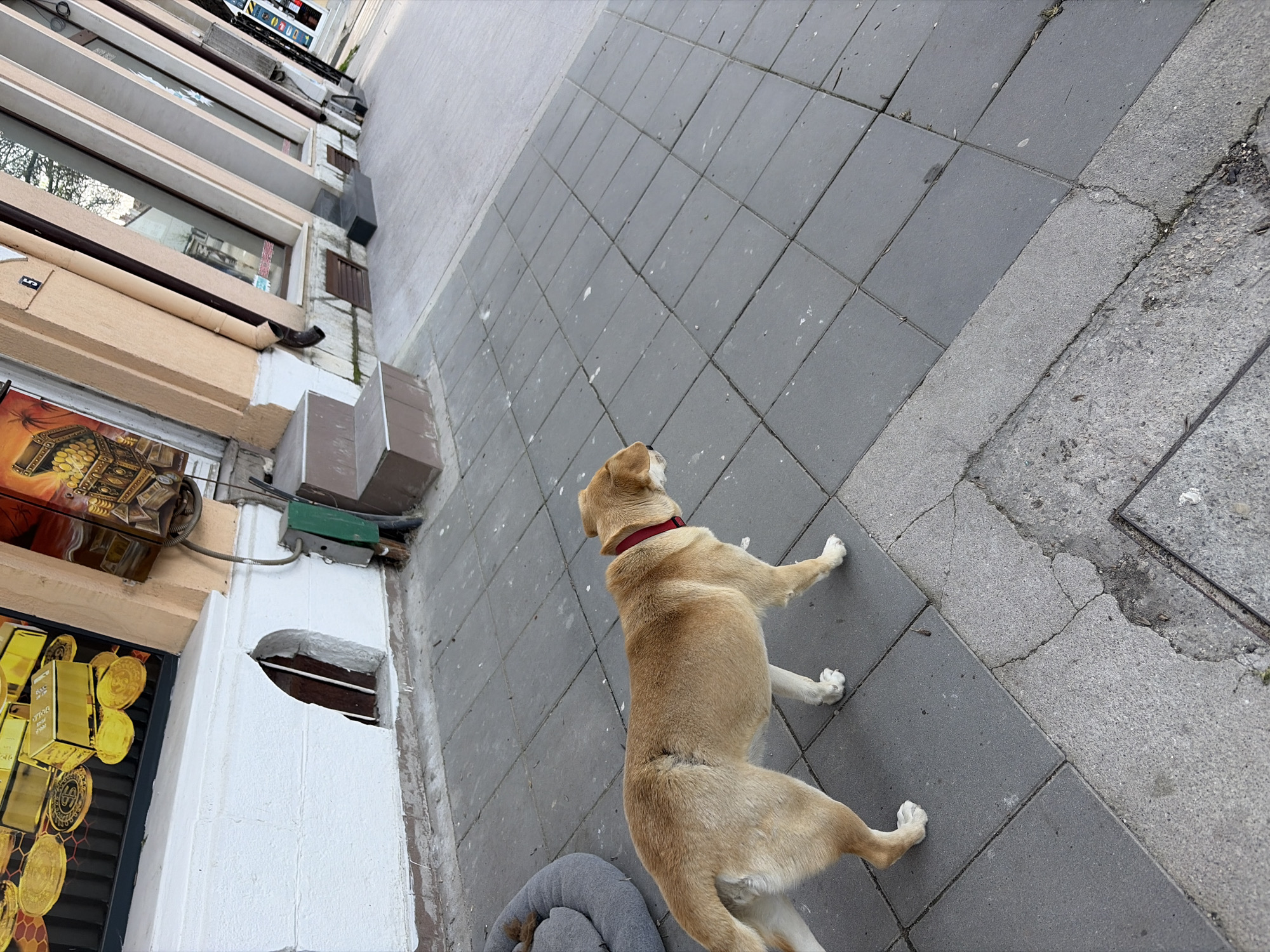 A medium-sized, tan-colored dog stands on a gray tiled sidewalk next to a building in the city of Vidin, Bulgaria. The dog wears a red collar. The building has multiple beige-colored levels and a store front, with a sign depicting gold coins and artifacts. The sidewalk transitions into a more weathered gray concrete area near the edge of the frame. A portion of a gray dog bed is visible in the lower left corner.