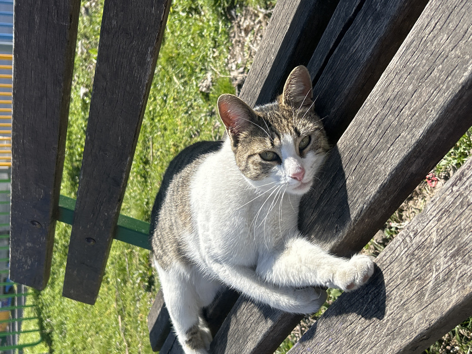 - "A domestic cat, predominantly white on its underside with tabby (brown, grey, black striped) markings on its back, head, and tail, is observed lying on its left side on a weathered wooden park bench" by FM-uXQlV2, licensed under CC BY 4.0
