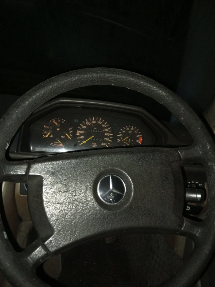 A close-up captures the steering wheel and dashboard of a Mercedes-Benz. The black, textured steering wheel features the iconic three-pointed star emblem. Behind the wheel, the instrument cluster displays the speedometer, fuel gauge, and other essential indicators. The speedometer reads around 40 km/h. A portion of the turn signal lever is visible on the right side of the steering wheel. The image is dimly lit, emphasizing the classic design elements of the car's interior.