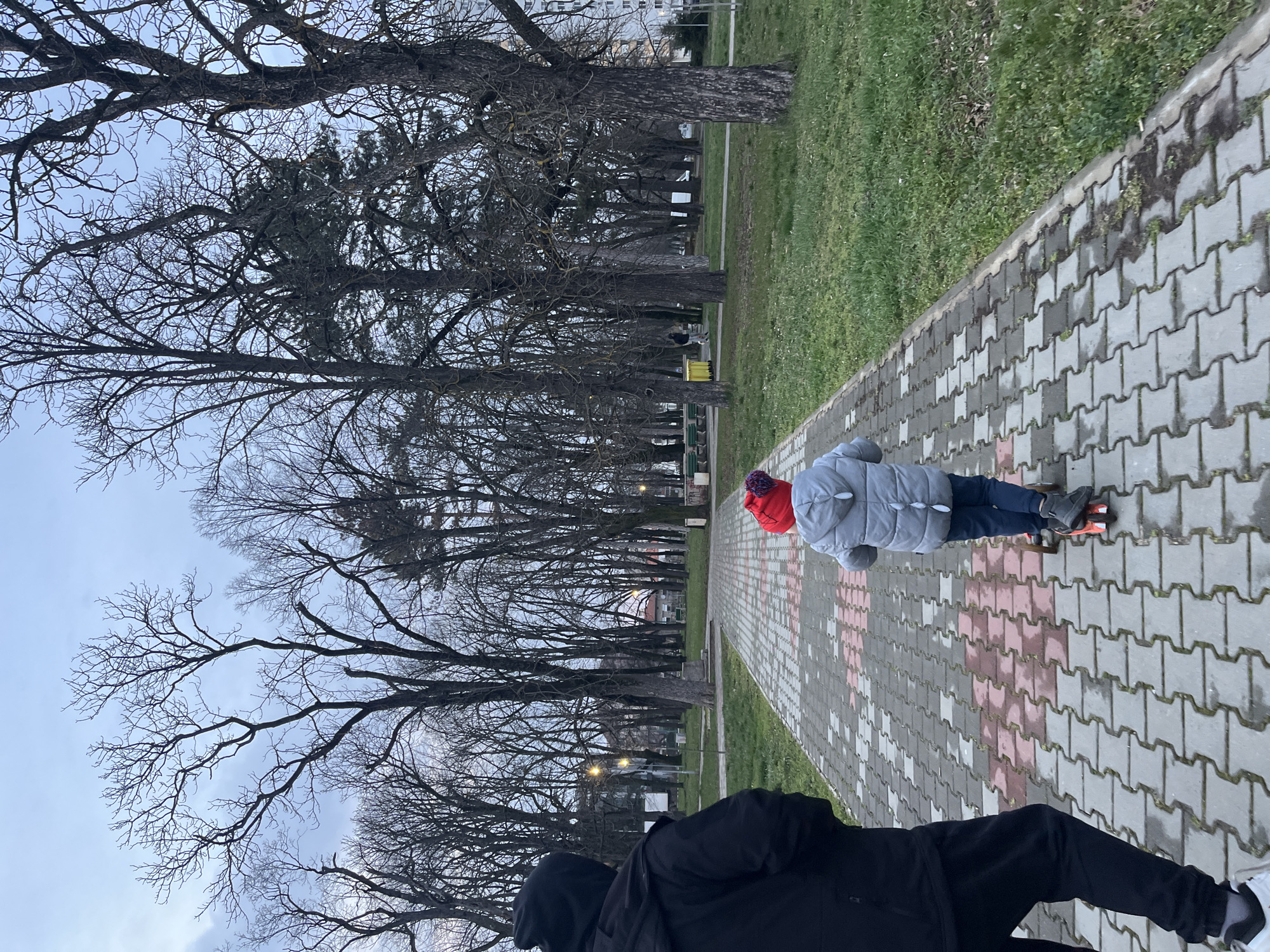 The image depicts an outdoor park scene in Targovishte, Bulgaria, under an overcast sky during late afternoon or early evening. A paved pedestrian pathway, constructed from interlocking grey and irregularly patterned red pavers, extends from the foreground into the mid-ground. On the left side of the path, an adult is partially visible from behind, wearing a black hooded jacket, black pants, and white-soled athletic shoes. Ahead and slightly to the right of the adult, a child is observed from behind, riding an orange and black kick scooter. The child wears a grey puffer jacket featuring dorsal fin-like adornments, blue pants, and a red knitted hat with a pom-pom. The path is bordered by green grass on both sides. The background is dominated by numerous deciduous trees, bare of foliage, suggesting a winter or early spring season. Some evergreen trees are interspersed among them. Visible in the mid-ground on the left are several green park benches. A yellow waste receptacle is partially visible on the right side of the path. Distant streetlights or park lights are illuminated, and structures resembling residential or commercial buildings are partially discernible through the trees in the far background.