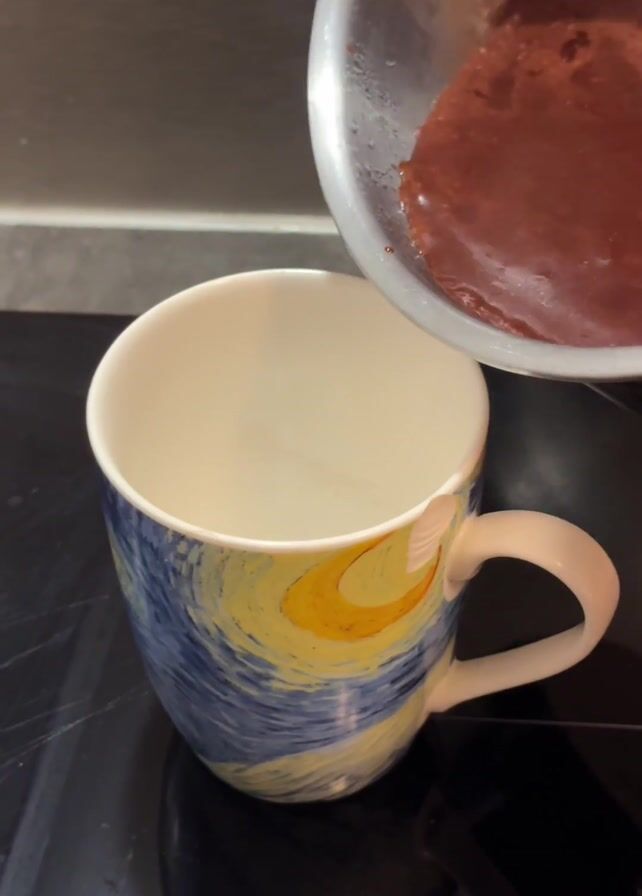 stainless steel saucepan pouring a dark brown liquid, presumably chocolate, into a white ceramic mug. The mug is decorated with a blue and yellow swirling pattern, similar to Van Gogh's "Starry Night." The mug sits on a shiny black stovetop surface. The background includes a gray wall.