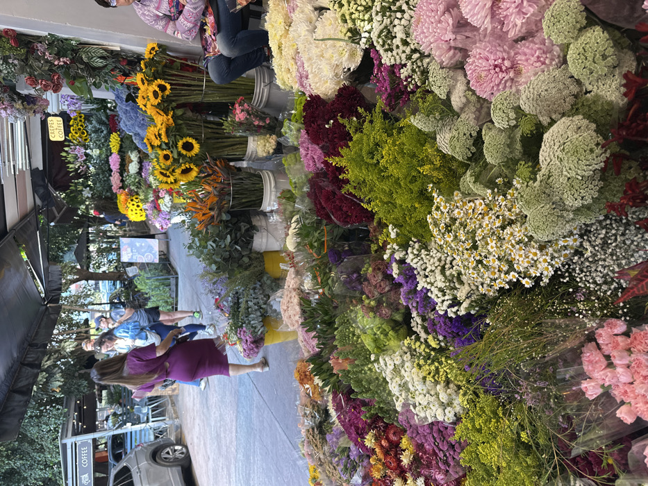 A vibrant flower market displays diverse floral arrangements. Sunflowers, daisies, chrysanthemums, and other blooms in whites, pinks, yellows, greens, and purples are densely packed. Some flowers are arranged in buckets. People browse the selection alongside a sidewalk near a coffee shop and parked car.
