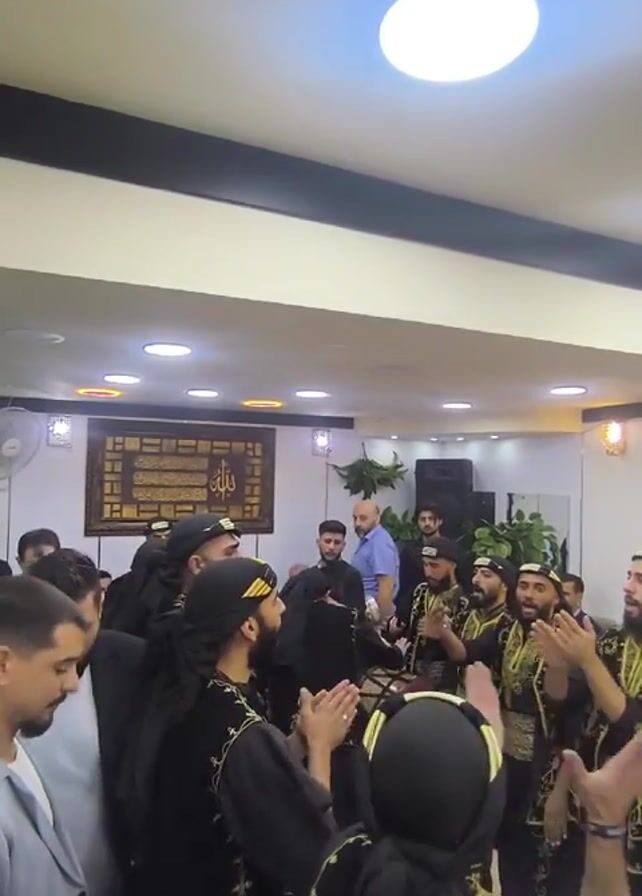 Several men, mostly with beards, stand in a well-lit room. Many are clapping and some are singing into a microphone. Most of the men are wearing black vests with ornate gold embroidery over black shirts, with black headbands; others are wearing casual clothing. There are overhead lights and decorations on the walls. A fan is visible.