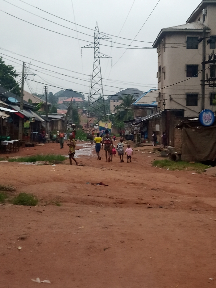 A dirt road bisects an impoverished neighborhood. On either side, shacks and small buildings with corrugated roofs huddle together. Several people are walking along the road, including a woman carrying something on her head and a group with young children. An electrical tower rises above the scene, power lines crisscrossing the sky. Trash is scattered on the ground. A multistory building stands to the right of the road, but the overall impression is one of poverty.