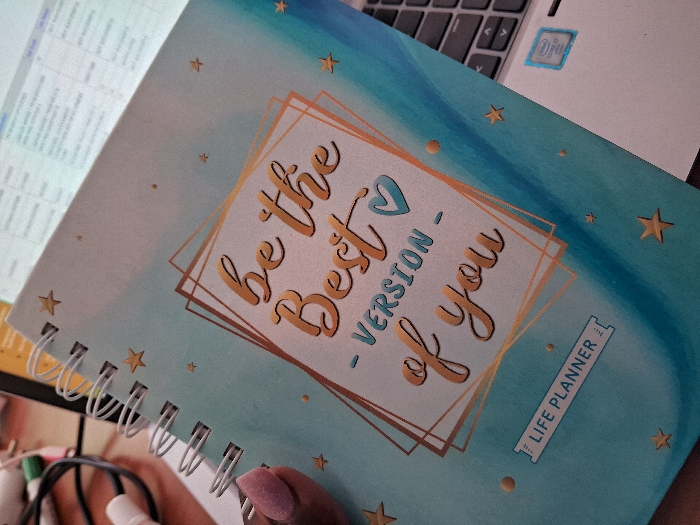 The scene depicts an indoor setting in Muthambi ward, Kenya, focusing on a desk area. A light blue and teal gradient spiral-bound "LIFE PLANNER" notebook is centrally positioned, held by a human left hand with a light pink, possibly glittered, fingernail. The planner's cover features gold foil text: "be the Best VERSION of you," with "VERSION" in blue, accompanied by a small blue heart icon and enclosed within a geometric gold frame. Gold stars and dots are scattered across the cover. White wire spiral binding is visible on the left edge of the planner. A dark-colored laptop is partially visible in the background and to the right, showing parts of its keyboard with dark gray keys and a white sticker bearing an Intel Core i7 logo. The laptop screen, out of focus, displays tabular data in light blue and white cells. Additional out-of-focus white objects and black cables are visible in the upper left background.