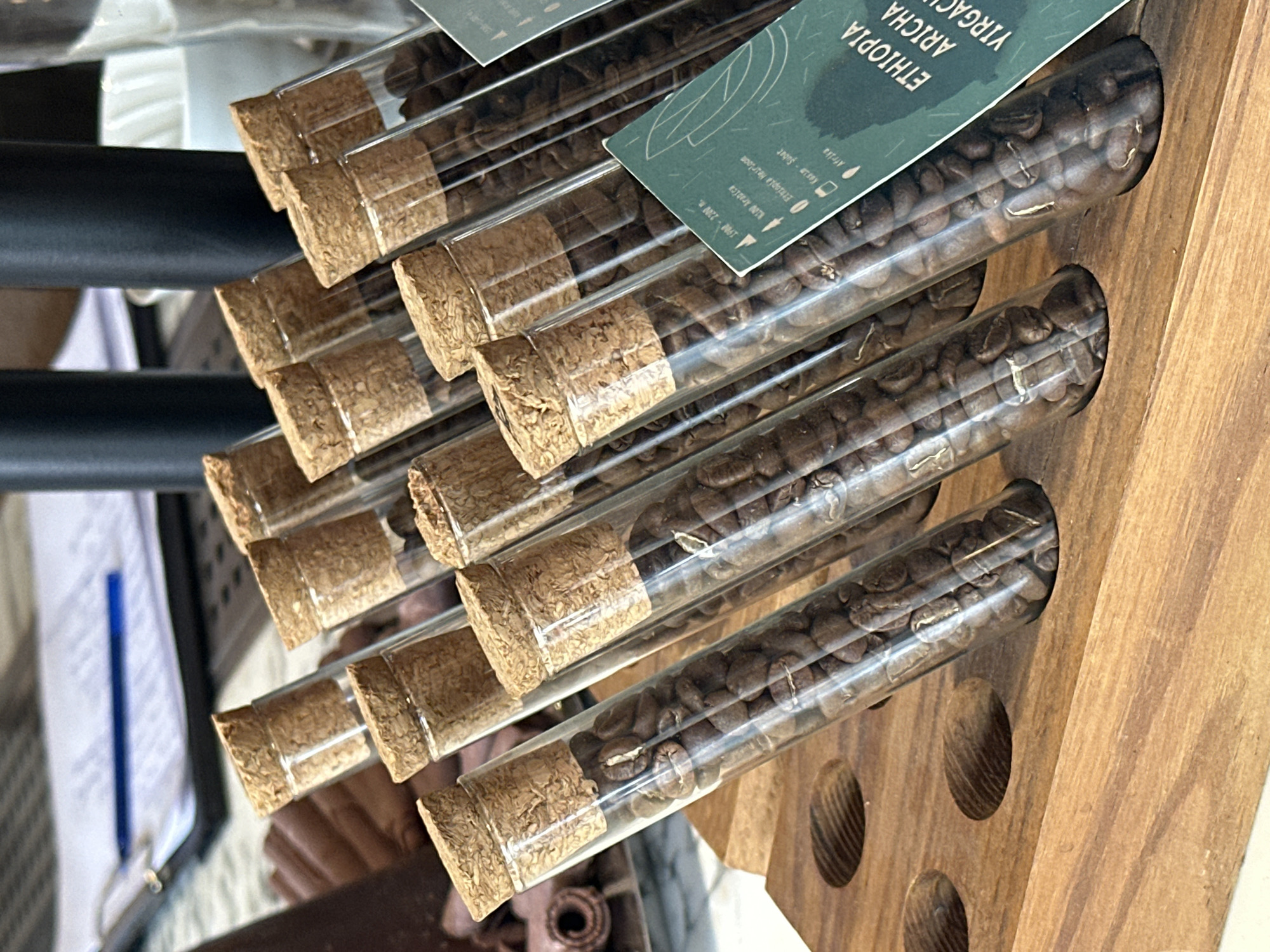 display of coffee beans in a retail setting. The coffee beans are contained in clear, cylindrical tubes with cork stoppers. A card attached to one of the tubes indicates the coffee is "Ethiopia Aricha Yirgacheffe." The tubes are arranged in a slanted wooden rack. There are other objects in the scene, including what seems to be a metal bar and paperwork. The image was taken in Bodrum, Turkey.