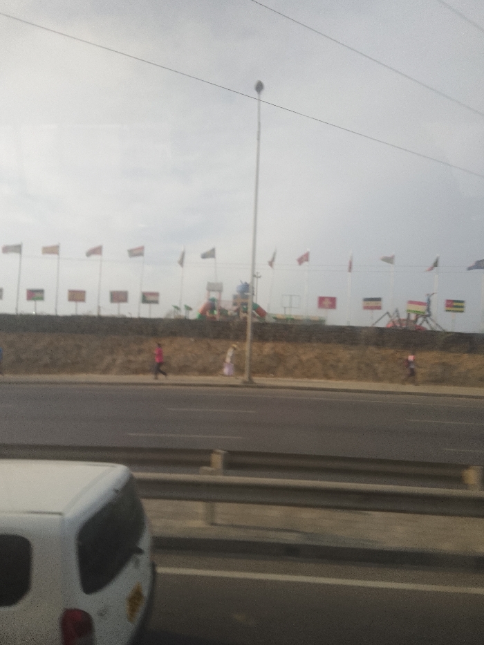 A roadside view reveals a highway with a partial view of a white van on the left. Beyond the road, a raised barrier is lined with numerous flags. A playground structure is visible amidst the flags. Pedestrians walk along the roadside. A tall light pole stands out against a cloudy sky with electrical wires crossing the scene.